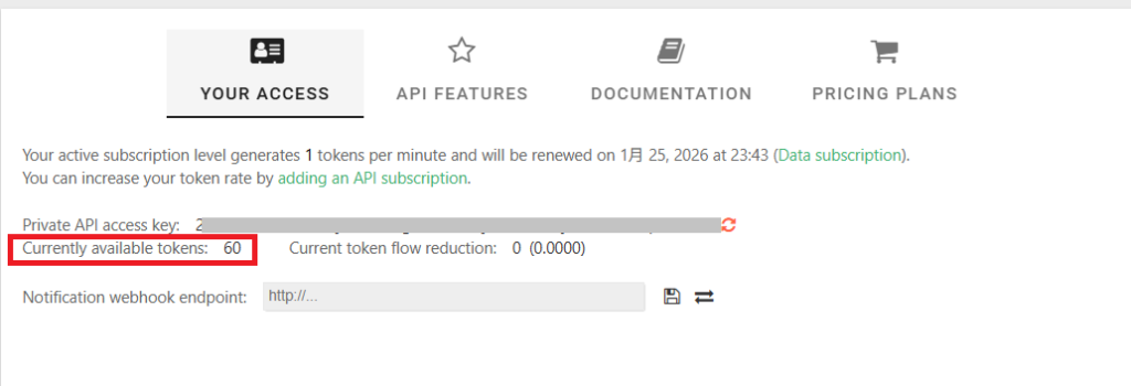 API をどれだけ使えるかは別途トークン制プラン(以下③)で決まりますが、Keepaの通常の有料プランに加入しているだけでも少しAPIが使えます。
