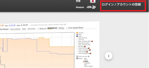 → 日本のAmazonを利用する場合は「Amazon.co.jp」を選択します。 - 作成済みのKeepaアカウントでログイン