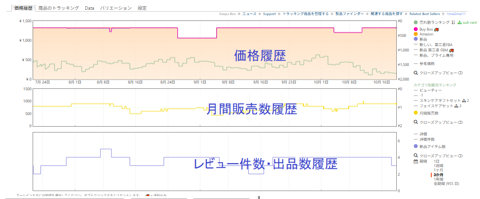 Keepaは、Amazon商品の価格・ランキング・出品者数の推移のデータを蓄積し可視化します。