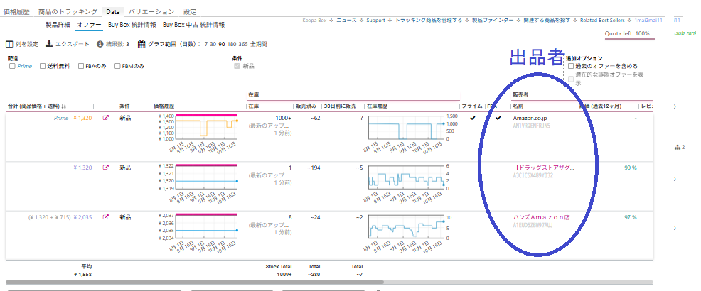各商品について出品者の価格履歴や在庫履歴販売数を確認できます。
